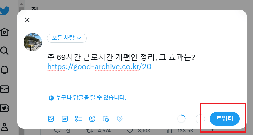 2. 게시물 작성 후 왼쪽 하단SNS로 보낼 수 있는 목록 아래 트위터 버튼 클릭그렇습니다